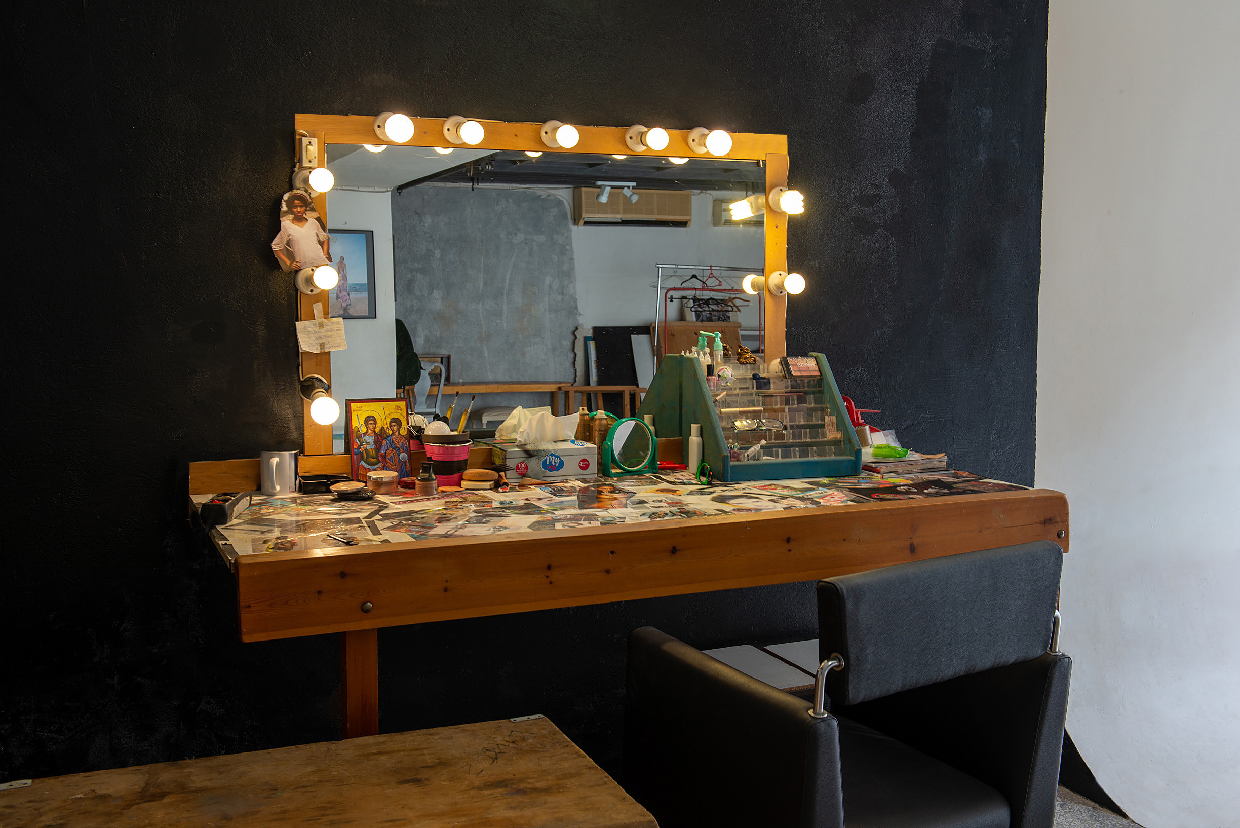A space only for Make up and Hair styling with a big table, mirror and lights.